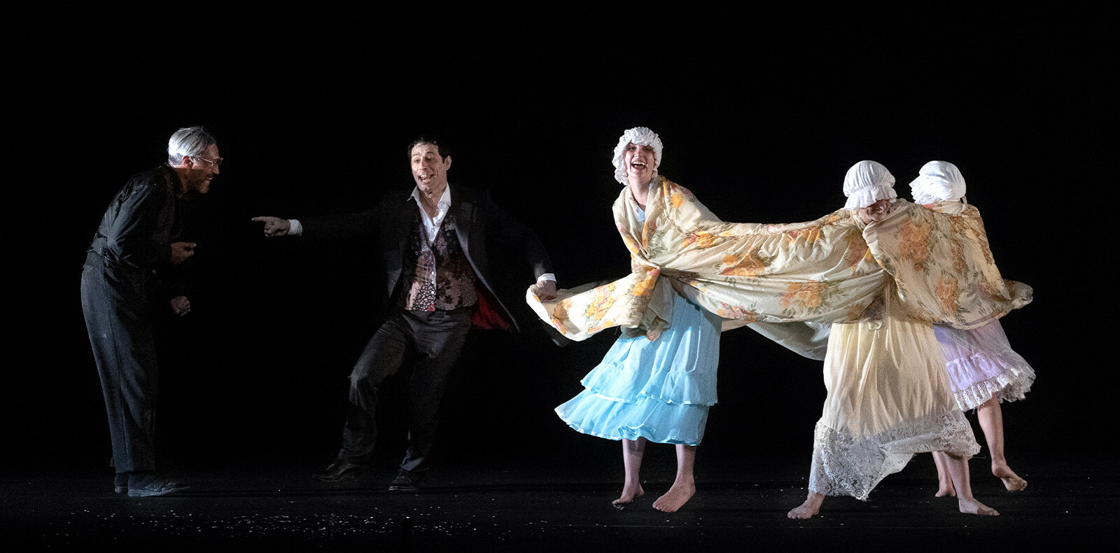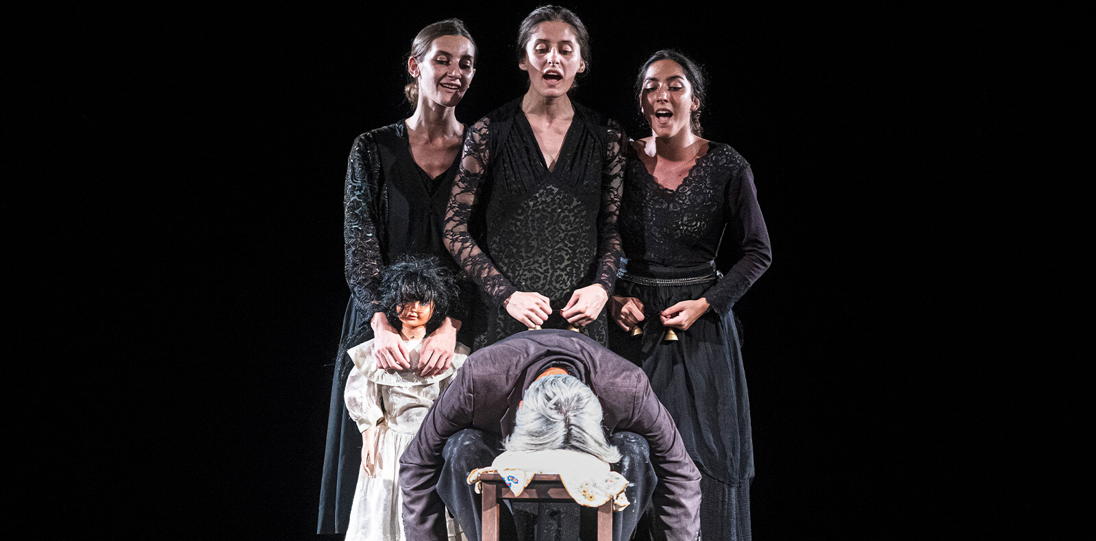 Dopo il debutto a Pompei e la partecipazione al Festival di Avignone arriva a Narni la nuova creazione di Emma Dante, una delle più interessanti, originali e acclamate registe italiane. Liberamente ispirato a lo cunto de li cunti di Gianbattista Basile, lo spettacolo racconta la storia di un vecchio che per sconfiggere la solitudine invita a cena, nella loro antica dimora, i defunti della famiglia.