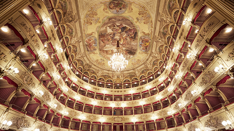 Alla sua edificazione concorsero molti dei migliori artisti dell’epoca fra cui ricordiamo: Baldassarre Orsini (decorazione del plafone raffigurante Apollo e le Muse; del sipario raffigurante gli orti di Alcinoo, re dei Feaci e i giochi in onore di Ulisse); Carlo Spiridione Mariotti (medaglioni raffiguranti Icaro che sacrifica a Bacco la poesia Drammatica, la Tragedia, la Commedia e la favola Pastorale, oltre i sedici cammei della volta); Giovanni Cappelli (parapetti dei palchi).