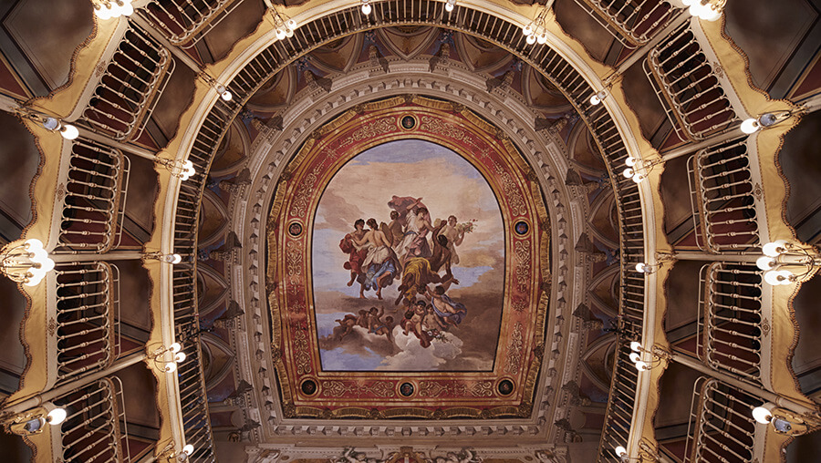 Il sipario originale è stato dipinto da Domenico Bruschi e vi è rappresentato “Properzio che addita al Torti la sua patria”. In attesa del ripristino dell’antico sipario, da restaurare, è stato realizzato un sipario a cura del pittore bevanate Luigi Frappi. Nel sipario odierno è rappresentato il cippo poetico, il tempietto del Clitunno ed il fiume Clitunno come viene immaginato dall’artista. Lo stemma sopra il sipario è stato donato da Innocenzo IV nel 1380, “OsF” sta per Ob servatam Fidem (per aver conservato ed osservato la fede per la Chiesa).
